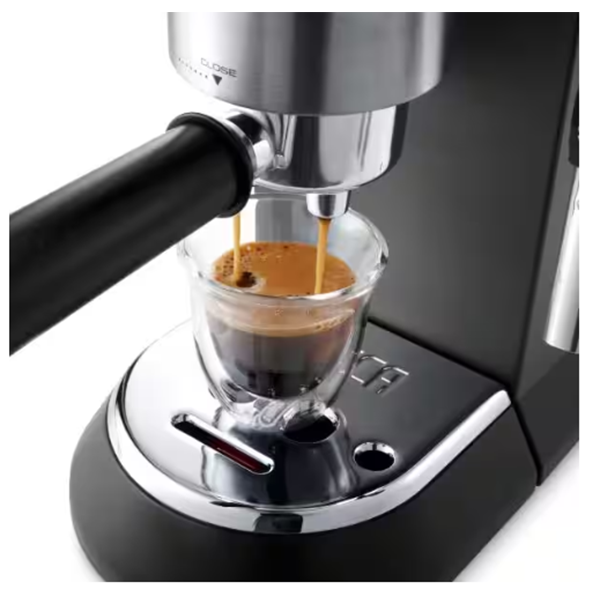- Stylish and compact coffee machine designed to complement your kitchen worktop. With its shiny stainless steel body and matt black finish, the Dedica espresso maker adds a touch of authentic Italian design to any kitchen. Enjoy a rich, smooth Espresso and use the Adjustable Cappuccino System to steam milk or finish your coffee with creamy milk foam.