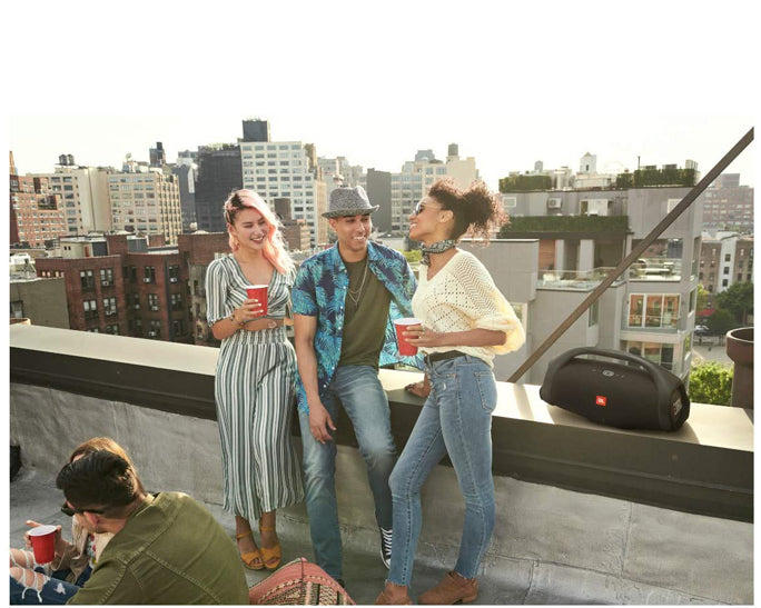 - Own the party. From backyard barbecues to weekend road trips, JBL Boombox 2 brings it with monstrous bass, bold design and up to 24 hours of play time. IPX7 waterproof and portable, this powerful speaker pumps out massive sound all day and all night. Plus, you can connect other JBL PartyBoost-compatible speakers to turn the party up. JBL Boombox 2 keeps your friends dancing and its built-in powerbank keeps your devices charged.